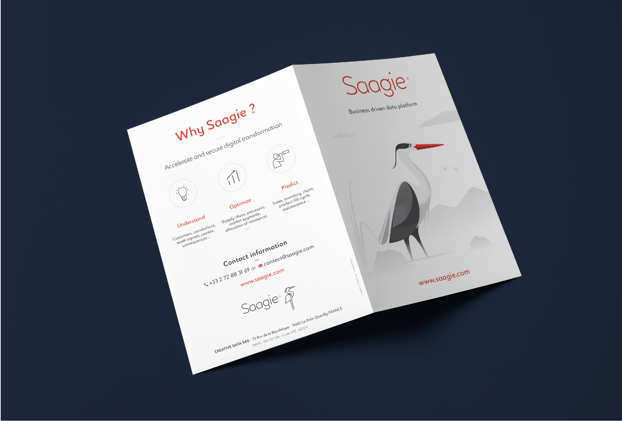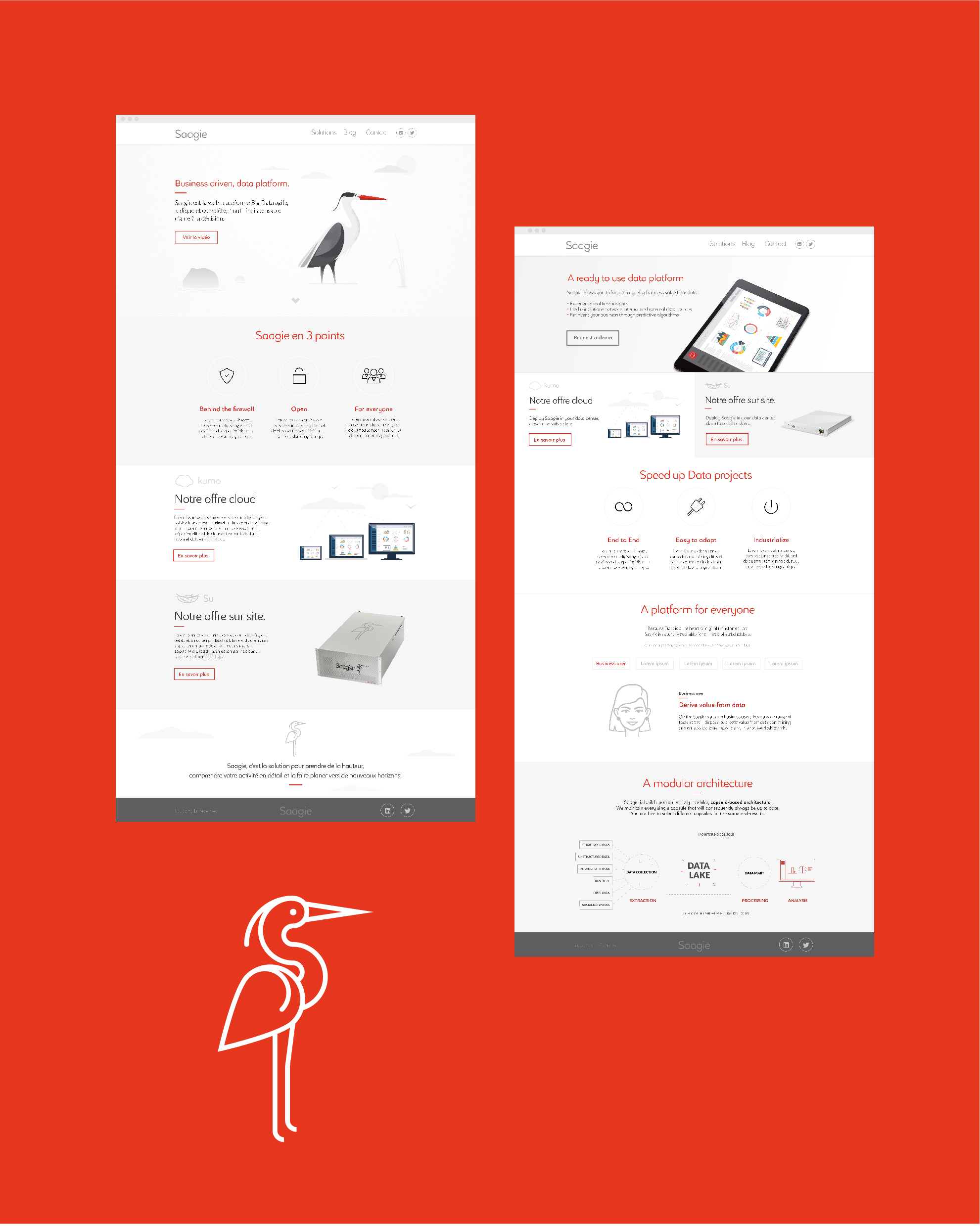 Pour les experts du Big Data en Normandie, Saagie souhaitait une identité de marque à la fois forte, élégante et mémorable. En s’appuyant sur la métaphore animale, nous avons construit un univers visuel sobre et évocateur, guidé par une palette de couleurs épurée et une typographie aux lignes nettes.