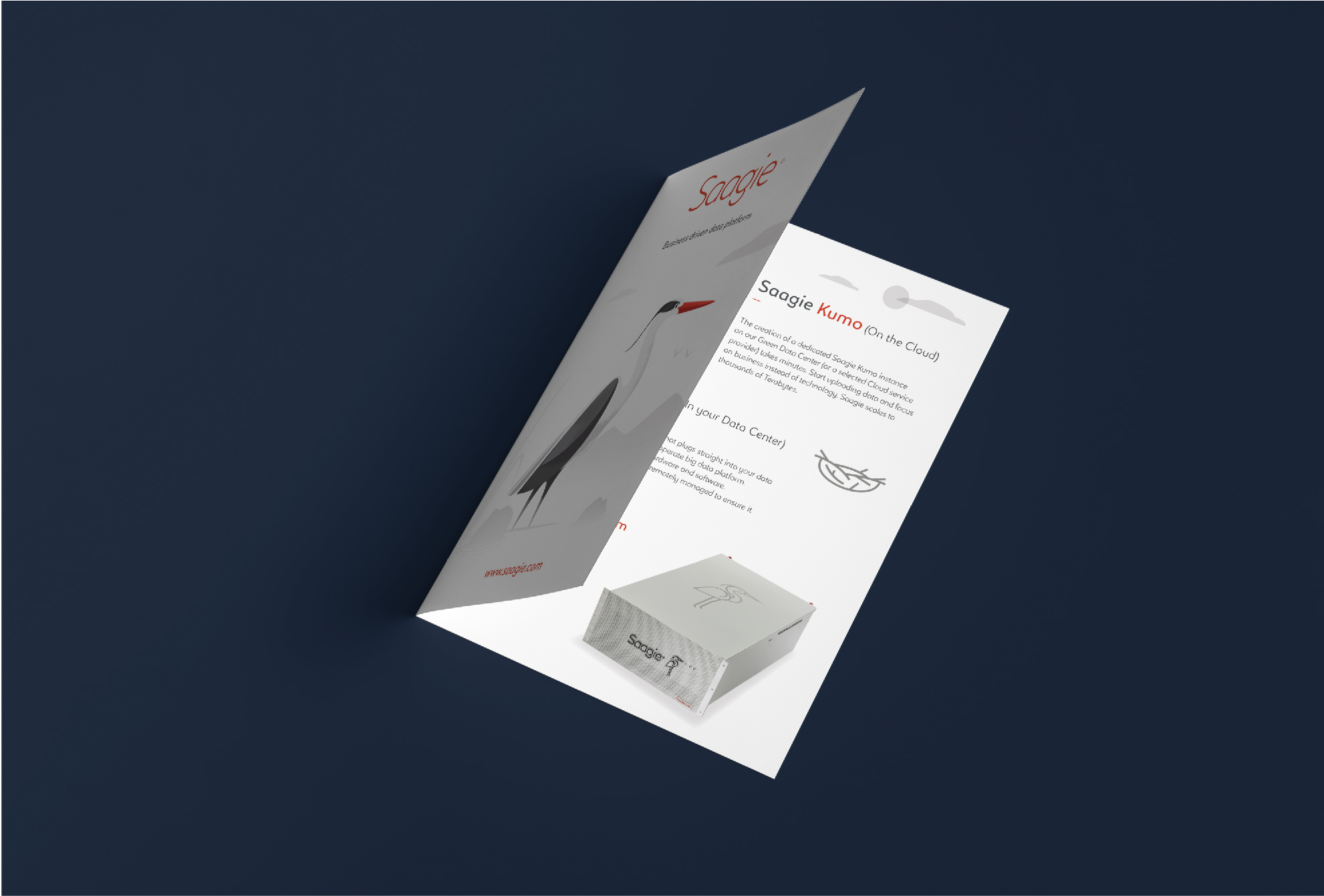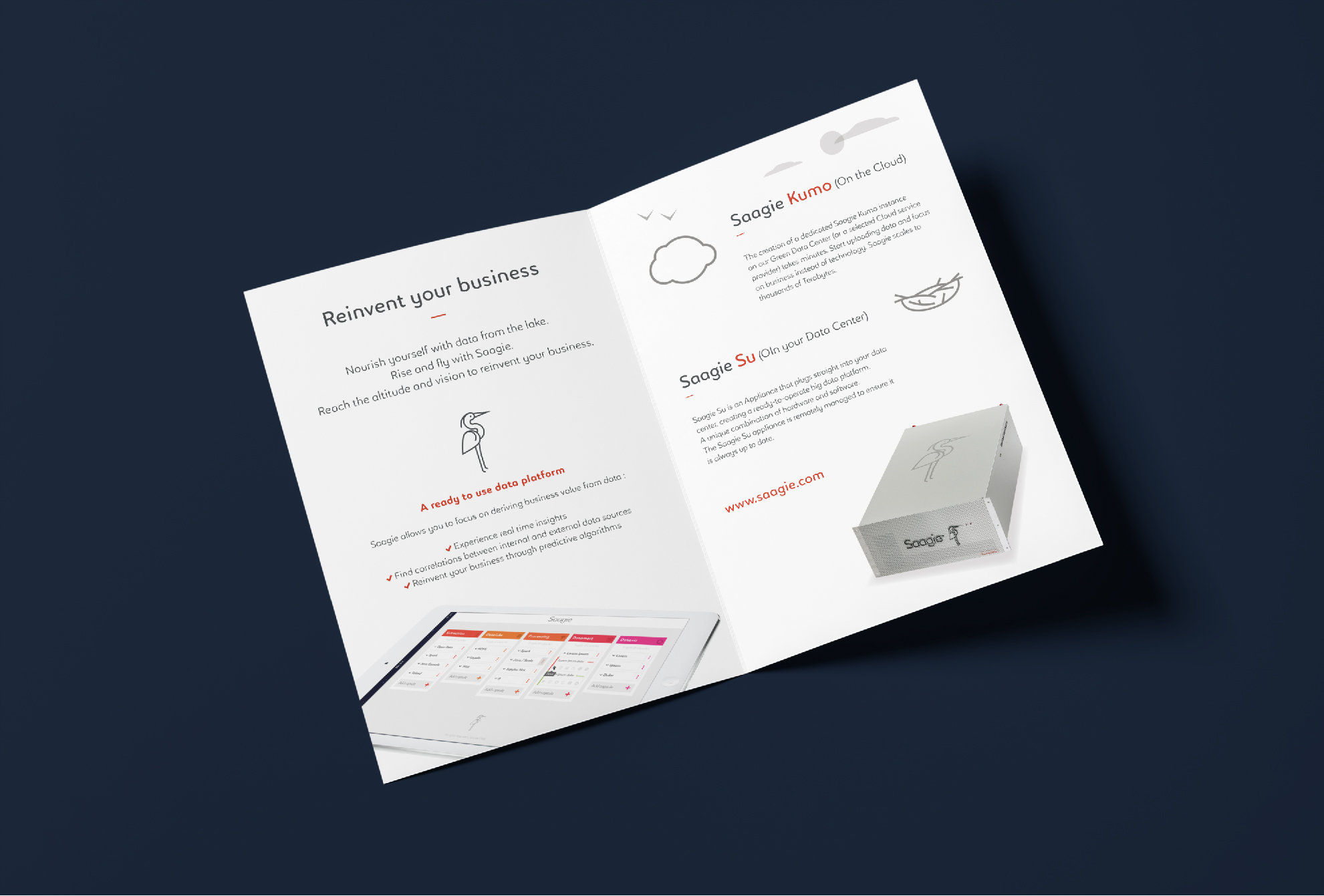 La charte graphique conçue par Drak s’adapte avec flexibilité aux supports de communication print et web : site internet, plaquettes commerciales, goodies (bouteilles, textiles, stickers) ou encore packaging produit (box de la marque). Chaque élément renforce l’univers de Saagie avec cohérence et sobriété.